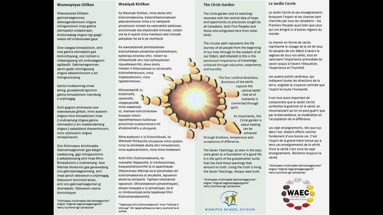 In the years to follow, the garden has grown and evolved to include a medicine wheel, interpretive signs, an inukshuk, seven teachings plaques, and countless plants and native species. The Circle Garden continues to be an integral part of The WAEC campus at 310 Vaughan St. as well as an important community space for Downtown Winnipeg. It is a key component of Indigenous lessons, celebrations and sacred ceremonies throughout the school year, and is used year-round by community members.
